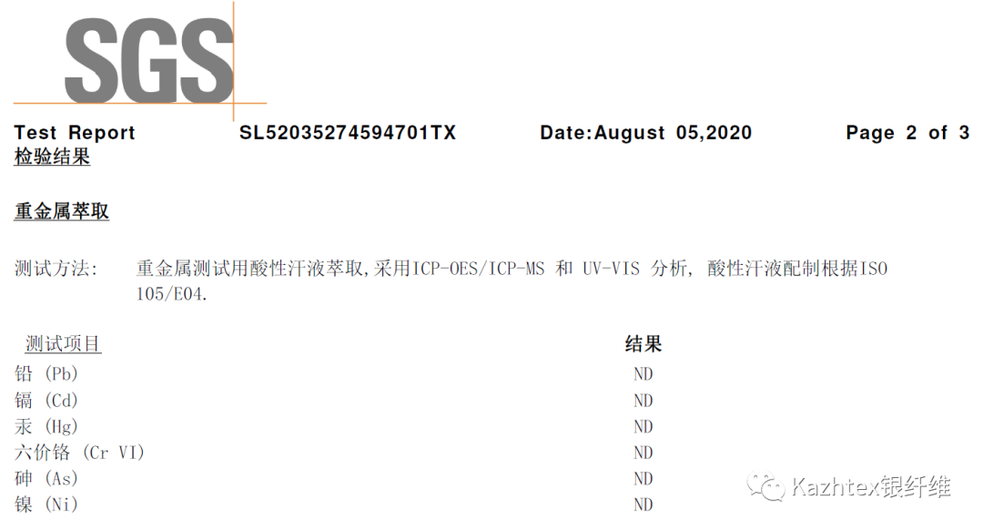 也有人会担心银纤维面料是一种金属面料,是否还有其他对人体有害的重金属呢,关于这一点,Kazhtex也是做了大量的检测的,结果是除了银以外未检出任何其他有害重金属,以下报告是很好的证明。