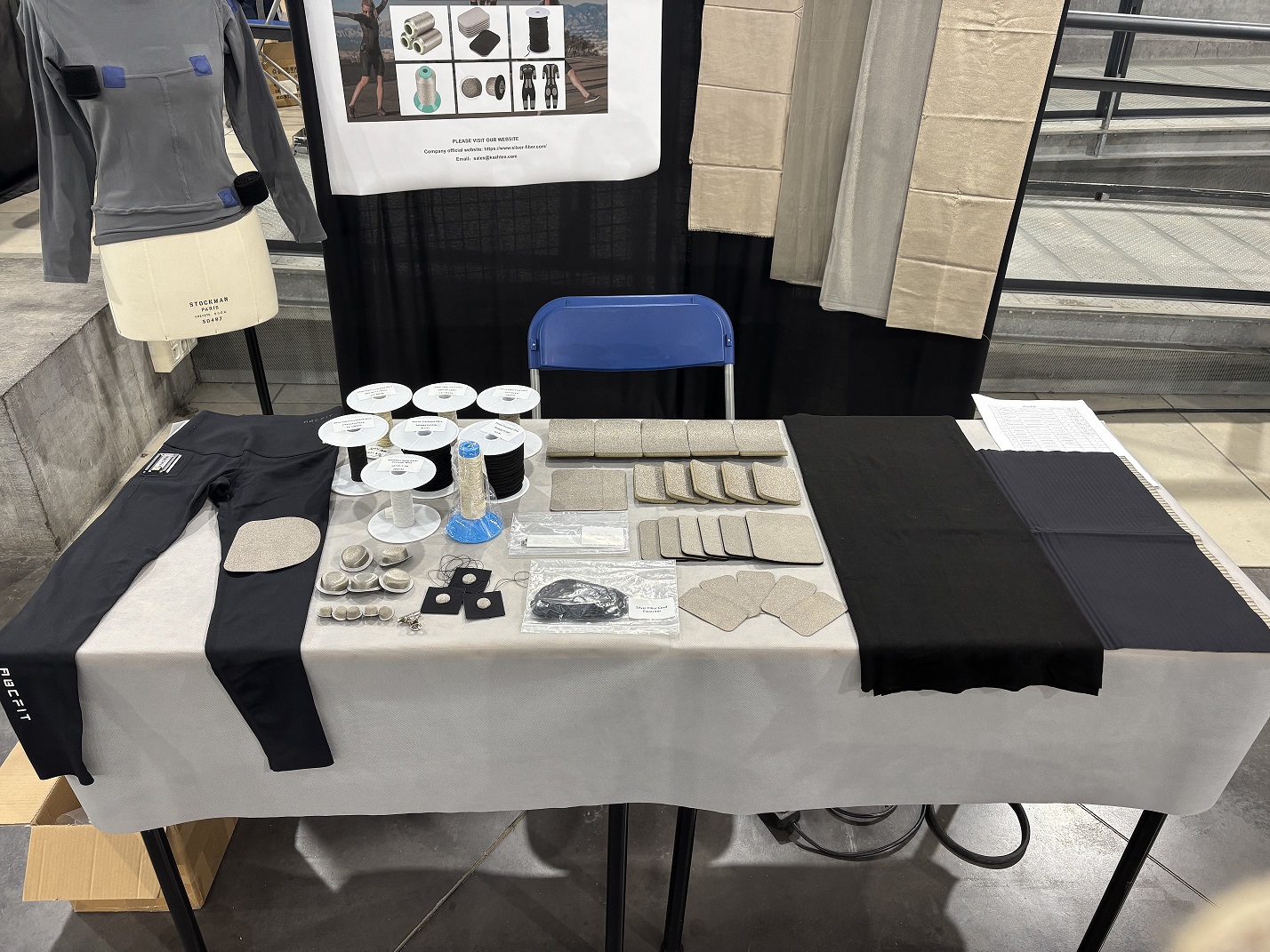 导电柔性织物传感器是我们的新产品,前面文章已经介绍过,该产品已被客户运用到实际产品中。我们的导电柔性织物电阻式压力传感器具有柔软性、舒适性和多功能性。这种导电柔性织物重量轻且易于成型,能贴合人体或复杂曲面,是便携式和可穿戴设备的理想选择。传感器区域、条纹宽度和条纹间距均可定制。 在会议上,我们还展示了适用于各种智能可穿戴设备的不同导电导线,电极片,其中银纤维防水绝缘弹性导线能满足大多数客户需求。